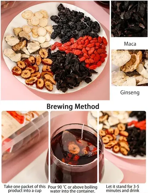 Ingredients:Ginseng(Five years or less artificial planting)、Wolfberry、Red date、Maca、Polygonatum sibiricum、Mulberry